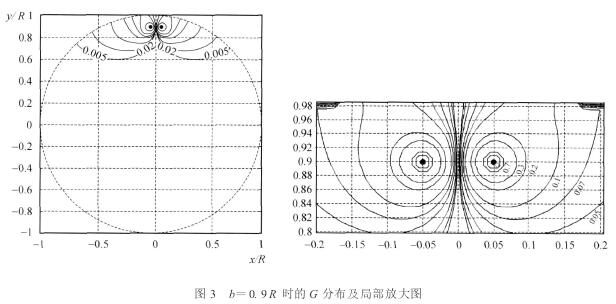 取(qu)b= 0.9R(R爲管道半徑),θ= 0.0555rad,繪(huì)制G分布并放大(da)電極附近區域(yù)如圖3所示。