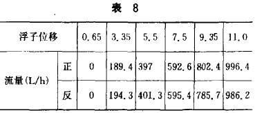 (8)儀表放(fang)置幾個月(yue)後(約半年(nian)),檢查原試(shi)驗數據是(shi)否保持穩(wen)定。由于轉(zhuan)換器曾與(yǔ)錯轉子相(xiang)配,調整的(de)位置已有(yǒu)變化,所以(yǐ)要重新調(diao)整“零位線(xiàn)”和線性(這(zhe)些工作都(dōu)是在不通(tōng)流量的條(tiáo)件下進行(hang)的),調整好(hao)後,測到的(de)流量數據(jù)見表8。