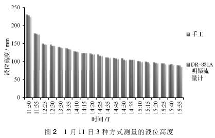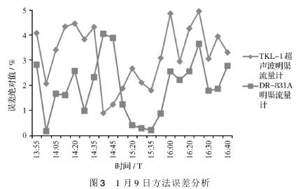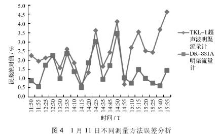 見圖3,以手(shǒu)工實測液位高度(du)爲基準,2種流量計(jì)的誤差均在±5%的範(fàn)圍内。除在12月16日14∶40和(he)14∶45兩個時間點測量(liàng)值😘表現😄出DR-831A測量誤(wu)差高于TKL-Ⅰ外,其他時(shi)段都明顯表現出(chū)DR-831A測量誤差小于TKL-Ⅰ。