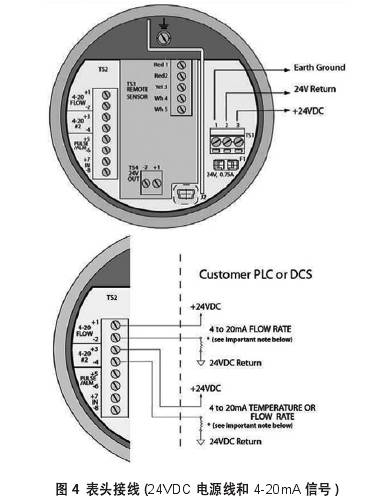 熱式(shì)質量流量(liang)計需要單(dan)獨提供24VDC直(zhí)流電源,因(yīn)此需要增(zēng)加1面220VAC轉24VDC的(de)就地電源(yuán)箱。表頭處(chu)接線如下(xia)圖4所示,右(yòu)側接🐅24VCD電源(yuán)線來自就(jiu)地電源箱(xiāng),左側接信(xin)号線送至(zhì)DCS。Fox熱式流量(liàng)計的4-20mA輸⛷️出(chū)均爲無源(yuan)輸出,需DCS側(ce)提供額外(wài)的24VDC電源,改(gai)造後的流(liú)量計無須(xu)壓力和溫(wen)度補償。