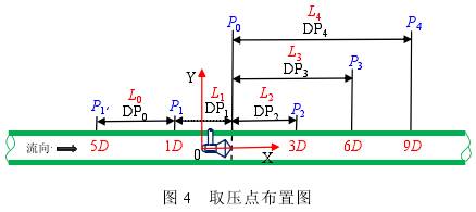 爲了(le)判斷V錐下遊的(de)壓力恢複位置(zhi),實驗過程中沿(yan)流🌈動方向在V錐(zhui)節流裝置上布(bu)置了P1′、P1、P0、P2、P3和P4共計6個(ge)取壓點,如🛀🏻圖4所(suǒ)示。其中,P1′、P1分别位(wèi)于V錐上遊5D和1D處(chu),P0位于V錐錐尾取(qu)壓♉口處,P2、P3和P4分别(bie)位于V錐下遊3D、6D和(hé)9D處,取壓點之間(jiān)的距離L0、L1、L2、L3、L4如🙇♀️圖4所(suǒ)示。實驗過程中(zhōng)👣測量5個差壓(△P0、△P1、△P2、△P3和(he)△P4)和一個壓力P4。其(qí)中,△P1爲前差壓,△P2、△P3和(hé)△P4爲後差壓。根據(ju)壓力P4與差💞壓之(zhi)間的關系,計算(suan)其餘5個取壓點(dian)處的靜壓。取壓(ya)點的位置💃、靜壓(yā)和♋差壓的關系(xì)見表1。