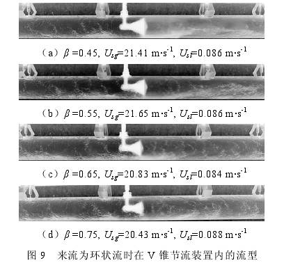 環狀(zhuang)流流過V錐節流(liu)元件時,由于V錐(zhuī)節流裝置環形(xíng)😄通🎯道特🌂點,V錐對(dui)環狀流的破壞(huài)較小,下遊仍然(ran)呈環狀流型(如(rú)圖9所示)。由☁️于喉(hou)🤟部的加速,氣液(ye)剪切作用強烈(lie),使得液膜破碎(suì)成液滴,導緻氣(qi)核中液滴夾帶(dài)量增加;相同工(gōng)況條件下,節流(liu)🍉比越小,液膜越(yue)容易破碎,氣核(he)中液滴夾帶量(liang)越大。