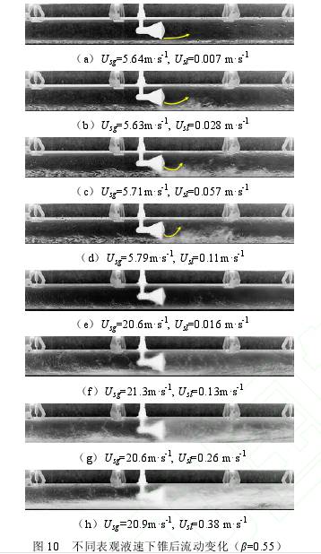 如圖10所示(shì):表觀氣速較低(dī)時,來流的表觀(guān)液量越大,錐後(hòu)❄️液👈體被卷吸的(de)高度也越高,卷(juan)吸距離越短,同(tóng)🧡時飛濺液量越(yue)多,越容易在下(xia)遊管壁上形成(cheng)液膜(見圖10a~10d);表觀(guān)氣速較高時,随(sui)着表觀液量增(zeng)大,錐後的氣液(yè)作用越劇烈,氣(qi)核中夾帶的液(ye)體越多,氣液分(fen)布越均勻(見圖(tu)10e~10h)。