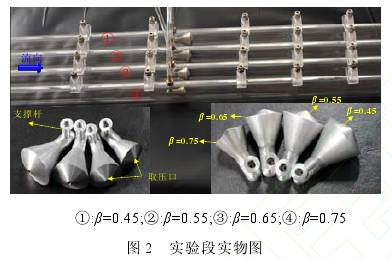 分(fen)别爲0.45、0.55、0.65和0.75的4個V錐(zhuī)流量計;同時,爲(wèi)了觀察氣液兩(liǎng)相流🈚的流型特(te)征及流經V錐前(qián)後的變化,測試(shì)管道采用透明(míng)的有機玻璃管(guan)。實✊驗段及錐體(ti)實物圖如圖2所(suǒ)示。