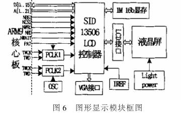 由(yóu)于AT91RM9200處理器未集(ji)成圖形顯示,核(he)心闆上也未提(tí)供🥰,所以,要實現(xian)圖形顯示,必須(xu)構建圖形顯示(shi)模塊。電路采用(yòng)LCD控制器SID13506顯示芯(xīn)片[7]實現彩色液(ye)晶點陣顯示和(he)VGA标準接口。系統(tǒng)框圖如圖6所示(shi)。