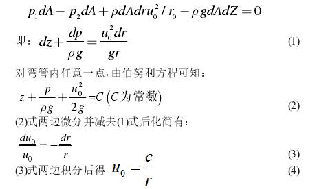 爲避(bì)免複雜的(de)彎道水流(liu)運動對實(shí)驗研究産(chan)生的✏️不利(li)因素,現假(jiǎ)設彎道内(nei)的水流爲(wèi)理想流體(tǐ)且爲恒定(dìng)流,各種運(yùn)動要素均(jun)不随時間(jiān)改變,彎管(guǎn)内的水流(liu)随水流的(de)運動得以(yǐ)充分發展(zhǎn)。因水流受(shòu)到彎管内(nei)壁的約束(shu)作用,當彎(wān)管通水時(shi),該作用迫(po)使水流改(gǎi)變原趨🥵勢(shi)運動方向(xiang),随着此約(yue)束的不斷(duan)增強,水流(liú)沿彎道作(zuò)急變流曲(qu)線運動。根(gen)據以上分(fen)析:彎🔞道管(guan)内的水流(liu)運動實際(jì)上是理想(xiǎng)流體所作(zuo)的曲線有(you)勢運動,且(qie)該運動以(yǐ)彎道曲率(lǜ)爲♍中心。進(jin)一步分析(xī)分布于該(gāi)彎管中任(rèn)意過水斷(duàn)面的水流(liú)如下:在彎(wān)道中任取(qu)n-n過水斷面(mian),并于水平(píng)線成夾角(jiǎo)α,在所截取(qǔ)的過水斷(duàn)面上取一(yī)⛷️微分柱體(tǐ),設彎管同(tong)一過水斷(duan)面内、外兩(liang)點的流速(sù)與壓強分(fen)别爲v1、v2和p1、p2,彎(wān)管的内半(bàn)徑爲🍉r0,彎道(dào)中任意點(dian)的流速爲(wei)u0,管道截面(mian)内任🌈意一(yi)點距圓形(xing)📧管道中心(xīn)的距離爲(wèi)r,該微分柱(zhù)體兩㊙️端形(xing)心點離基(jī)準面高度(du)分别爲z1和(hé)z2,作用在微(wei)分柱💃體上(shang)🏃🏻的力在n方(fāng)向上的投(tou)影分别爲(wèi)該柱✌️體兩(liǎng)端面⭕上的(de)動水壓力(li)與,其自重(zhòng)沿n方🔞向的(de)投影,其所(suǒ)受的離心(xīn)慣性力爲(wei),在理想流(liú)體的勢流(liú)流🈲動中,由(yóu)于n方向與(yu)流線正交(jiāo),此方向上(shàng)各力代數(shù)和爲零,有(you):