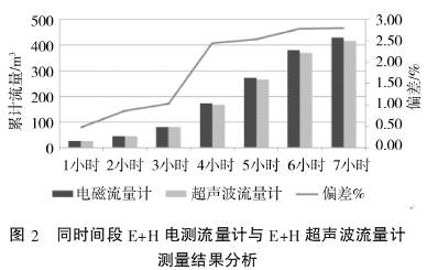 本(ben)次測試(shi)用的儀(yí)器爲E+H公(gōng)司的電(diàn)磁流量(liàng)計,型号(hào):Promag50W8H,DN800(管徑800mm),橡(xiàng)膠内襯(chèn)(耐磨),精(jing)度0.2%,不鏽(xiu)鋼電極(ji)。和E+H單聲(sheng)道夾裝(zhuang)式超聲(sheng)波流量(liang)計,型号(hao):91WA1,可測試(shi)管徑爲(wei)100~2000mm,精度0.2%。測(ce)量結🏃果(guǒ)如表2所(suǒ)示。