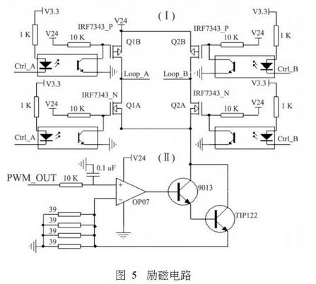 其中,電路(lù)(I)是由4隻光(guāng)耦和2片場(chǎng)效應管RF7343(每(mei)片中有一(yī)隻N溝道和(he)一隻P溝道(dao)型的場效(xiào)應管)組成(chéng)的橋式開(kai)關電🏃🏻♂️路。通(tōng)過兩路控(kòng)制信号CtrlA和(hé)Ctrl_B的高低電(diàn)平來控制(zhì)場效應管(guan)的通斷,從(cóng)而✏️實現了(le)勵磁線圈(quan)中電流方(fāng)向的切換(huan)。電路(I)是由(yóu)一片運算(suàn)放大器OP07.-隻(zhi)🌍NPN型三極管(guan)S9013、一隻NPN型三(san)極管TIP122和4隻(zhi)399采樣♈電阻(zǔ)組成的恒(heng)流源。由MCU的(de)定時器脈(mo)沖寬度調(diao)制(PWM)輸出經(jīng)過RC電路濾(lü)波後來控(kong)制流過勵(li)🤟磁線圈的(de)電流I從而(ér)産生三值(zhi)正弦矩形(xíng)波♈。
