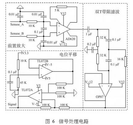 電極(ji)輸出的感(gan)應電動勢(shì)信号(微伏(fu)至毫伏級(ji)的交變信(xìn)号)首先經(jīng)過RC電路濾(lü)除部分高(gao)頻幹擾信(xin)号,然後送(song)入儀用放(fang)💰大器✉️AD620進行(háng)差分放大(dà),但是由于(yú)幹擾成份(fèn)較☀️多,且有(you)👈的幹擾信(xin)号幅值遠(yuǎn)大于信号(hao)本身,因此(cǐ)AD620的增益不(bú)宜設置得(de)過大,10~20倍爲(wèi)佳。流量信(xin)号經過AD620放(fang)大後,采用(yong)單端輸出(chu)(對地電壓(ya))方式後通(tong)過電容隔(ge)直,濾去了(le)直流分量(liàng),僅保留信(xìn)号的交流(liú)分量。由于(yú)測量電路(lù)器件本身(shēn)存在噪聲(shēng)以及其他(tā)幹擾,特别(bie)是50Hz的工頻(pín)幹擾💁,有必(bì)要對信号(hào)再次濾波(bō),在此選取(qǔ)了雙🈲T帶阻(zǔ)濾波,電容(rong)C取Q1μF,中心頻(pin)率f爲50Hz則R=1/?。C)=1/(2πf0C)≈321Ω。最(zui)後把正負(fù)交變的信(xin)号進行電(dian)壓平移,即(ji)整體提升(shēng)信号幅值(zhí),使之都爲(wei)正值後送(song)入MCU的ADC引腳(jiao)。