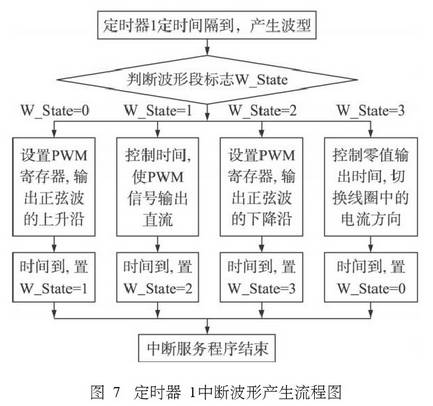 定(ding)時器1用于(yú)産生三值(zhí)正弦矩形(xing)波,流程圖(tú)如圖7所示(shì)🌈。程序中✍️設(she)置兩個有(you)32個元素的(de)數組分别(bié)存放用于(yu)生🈲成正弦(xián)波上升沿(yan)和下降沿(yán)的占空比(bǐ)數據,依次(ci)使用🤞這些(xie)值來設置(zhì)定時器的(de)TM1__OCAR寄存器,控(kòng)制PWM輸出的(de)占空比,進(jin)而控制RC濾(lü)波電路輸(shū)出的電壓(ya)大小,最♌終(zhōng)得到設計(ji)的波形。