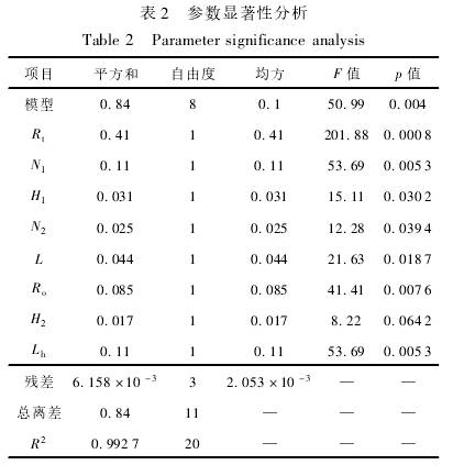 對表1試(shi)驗中各因(yin)素進行顯(xian)著性分析(xi),分析結果(guo)如表2所示(shì),模型顯著(zhe)差異水平(píng)p=0.004,說明.回歸(guī)方程關系(xì)顯著;決定(dìng)系數R2=0.9927,說明(ming)回歸有效(xiao),試驗結果(guo)可靠。由表(biǎo)2還可以看(kan)出8個因素(su)均對流量(liàng)計線性度(dù)誤差影響(xiang)顯著,其中(zhōng)葉輪葉片(piàn)數N1、葉輪頂(ding)端半徑R1、葉(ye)片輪毂半(bàn)徑R.。、葉輪輪(lun)毂長度Lh這(zhè)4個爲顯著(zhe)影響參數(shu),在後文中(zhōng)運用響應(yīng)面法進行(hang)優化;而葉(ye)輪導程L、前(qián)導流件長(zhang)度H1、後導流(liú)件長度H2、導(dǎo)流體葉片(piàn)數N2這4個爲(wei)次顯著影(yǐng)響參數,在(zai)後文中運(yùn)用正交試(shi)驗進行優(you)化。