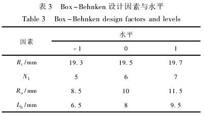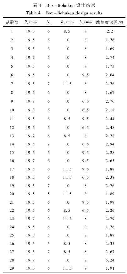 采用Box-Behnken中心(xin)組合設計(jì)方法,以葉(yè)輪頂端半(ban)徑Rt、葉片數(shu)N1、葉片輪毂(gu)半徑R.。、葉輪(lun)輪毂長度(du)Lh這4個顯著(zhe)影響因素(sù)爲自變量(liàng),儀表系數(shu)線性度誤(wù)差爲響應(ying)值,其餘結(jié)構參數保(bao)持不變,設(she)計四因素(su)三水平29個(gè)試驗點的(de)響應面優(yōu)化試驗。因(yin)素與水平(píng)見表3,試驗(yan)設計見表(biǎo)4。
