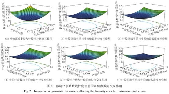 從圖2(a)~(f)可形(xing)象地看出(chū)影響儀表(biao)系數線性(xing)度誤差的(de)幾何參數(shù)間交互作(zuo)用。比較圖(tu)2各個分圖(tu)可知,葉輪(lún)頂端半徑(jìng)R1對儀表系(xì)數線性度(du)誤差的影(yǐng)響最爲顯(xiǎn)著,表現爲(wèi)曲線最陡(dǒu),其餘因素(su)影響大小(xiǎo)順序爲葉(ye)輪葉片數(shu)N1>葉輪輪毂(gū)長度Lh>葉輪(lun)輪毂半徑(jing)R。這也與表(biao)5的方差分(fèn)析結果相(xiang)吻合。