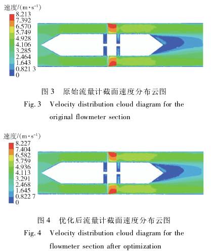 圖3和圖(tú)4分别爲原(yuan)始流量計(jì)與優化後(hou)流量計的(de)截面速度(du)分布雲圖(tú)。對比圖3和(hé)圖4可以看(kan)出,優化後(hou)的流量計(ji)在後導流(liu)件.上下部(bu)分的流場(chǎng)速度分布(bù)較原始流(liu)量計更加(jiā)均勻,說明(ming)優化後流(liú)量計的葉(yè)輪結構在(zài)流場中的(de)旋轉穩定(ding)性更好,從(cóng)而使得測(ce)量精度得(de)到提高。