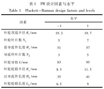 根據.Plackett-Burman(PB)試驗(yàn)設計,選取(qǔ)8個試驗因(yin)素(葉輪頂(dǐng)端半徑、葉(yè)輪葉片數(shu)、葉輪輪毂(gu)半徑、葉輪(lún)輪毂長度(du)、葉輪導程(chéng)、前導流件(jian)長度、後導(dǎo)流件長度(dù)、導流體葉(yè)片數)和3個(gè)空白因素(sù),每個因素(sù)設高、低兩(liǎng)個水平,以(yi)儀表系數(shu)線性度誤(wù)差爲響應(ying)值,共計12個(ge)試驗,試驗(yàn)設計因素(sù)及水平見(jiàn)表1。