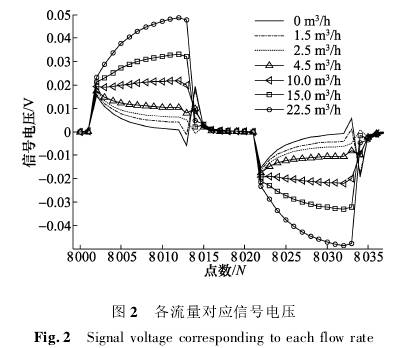由于勵(lì)磁電流沒(mei)有達到穩(wěn)态,與之對(dui)應的信号(hào)電壓也處(chù)于非穩态(tai)過程,主要(yao)包含流量(liàng)分量和微(wēi)分幹擾兩(liǎng)部分,但是(shi),實際采集(ji)到的傳感(gǎn)器信号引(yǐn)入了直流(liú)偏置和50Hz工(gōng)頻幹擾,爲(wèi)此,對信号(hao)電壓進行(háng)梳狀帶通(tōng)濾波處理(li)以消除直(zhí)流偏置和(hé)工頻幹擾(rao)。各流量下(xia)信号電壓(yā)梳狀帶通(tōng)濾波後的(de)結果如圖(tú)3所🔞示,信号(hao)電壓幅值(zhí)由低到高(gao)對應的流(liu)量依次🈚爲(wei)0~22.5m3/h。其中,圖2中(zhōng)信💯号電壓(ya)與圖1中前(qian)2個半周期(qī)的勵磁電(diàn)流相對應(ying),爲正負兩(liang)個半周期(qī)。可以看出(chū)☁️,在非穩态(tài)上🐅升過程(chéng)中,信号電(dian)壓的✏️幅值(zhi)與管道内(nèi)流量大🔴小(xiao)仍🚶♀️是相關(guan)的。當流量(liàng)爲零時,信(xìn)号電壓主(zhu)要爲微分(fèn)幹擾。