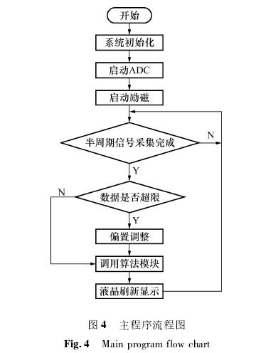 軟(ruan)件設計采(cai)用模塊化(hua)設計方案(an),主要功能(neng)模塊有🛀🏻:初(chū)始化模塊(kuai)、驅動模塊(kuài)、數據處理(lǐ)模塊、人機(ji)接口模塊(kuai)等,程序流(liú)程圖如🈲圖(tú)4所示。系統(tong)上電後先(xian)進行初始(shǐ)化,然後配(pei)置兩片ADC同(tóng)步采樣,開(kai)啓勵磁中(zhong)斷,勵磁開(kāi)始工作。半(bàn)周期采樣(yàng)結束後判(pan)斷采集到(dao)的信号㊙️電(diàn)壓是否超(chao)限,之後調(diao)用算法模(mo)塊,刷新液(ye)晶顯示。在(zài)算法模塊(kuai)中,先是對(duì)采集到的(de)信号電壓(ya)進行梳狀(zhuang)帶通濾波(bō)處理,再将(jiāng)濾波後的(de)電壓除以(yǐ)對應勵磁(ci)電流,然後(hòu)對電壓⚽電(diàn)流比值進(jìn)行半周期(qī)幅值解調(diao),對解調🔞後(hou)的比值取(qǔ)5點求均值(zhi)作爲輸出(chu)結果參與(yǔ)到流速的(de)計算。