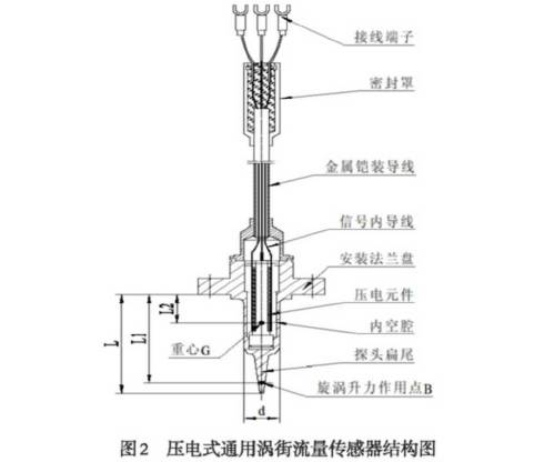 爲此,采(cǎi)用了壓(ya)電傳感(gan)器與旋(xuan)渦發生(sheng)體(三角(jiao)柱)分離(li)型⛹🏻♀️的結(jie)構方案(an),即研制(zhì)了種小(xiǎo)尺寸懸(xuán)臂梁凹(āo)結構的(de)壓電式(shì)通用渦(wo)街流量(liang)傳感器(qì)(簡稱壓(ya)電傳感(gǎn)器),壓電(diàn)😄傳感器(qì)結構如(ru)圖2所示(shi),由安裝(zhuāng)法蘭盤(pan)、探頭‼️扁(biǎn)尾、壓電(diàn)元件、铠(kai)裝導線(xian)、密封罩(zhao)、接線端(duan)子等組(zǔ)成。壓電(diàn)傳感器(qi)🏃♂️通過中(zhong)部的安(an)裝法蘭(lán)盤與流(liú)量計殼(ké)📱體固定(dìng),下部的(de)懸臂梁(liáng)置于旋(xuán)渦發生(sheng)體内的(de)孔洞中(zhōng),壓電傳(chuan)🏒感器的(de)探頭扁(bian)🌈尾通過(guò)發生體(ti)兩側的(de)側孔獲(huò)取旋渦(wō)升力作(zuo)用。并傳(chuán)感出相(xiang)應的渦(wō)街流量(liàng)信号。在(zai)懸臂梁(liáng)内部,壓(ya)電元件(jiàn)機械封(feng)裝在探(tàn)頭内♌空(kong)腔中,空(kong)餘空腔(qiang)則無其(qí)它填充(chong)物。壓電(dian)元件通(tōng)過✉️剛性(xing)結構的(de)铠裝導(dao)線将信(xin)号輸出(chu)到外部(bù)的接線(xian)端子上(shang),再通過(guò)接線端(duan)子🈲将信(xìn)号輸出(chu)到外部(bù)信号處(chù)理電路(lù)進行處(chu)理。當管(guǎn)道流體(tǐ)因漩渦(wo)⁉️發生體(ti)産生渦(wo)街後,伴(ban)随産生(sheng)的交變(bian)升力F,作(zuò)⁉️用在懸(xuan)臂梁下(xia)部的探(tan)頭扁尾(wěi)上,懸臂(bì)梁産生(shēng)變形并(bìng)迫使内(nèi)部的💰壓(yā)電元件(jian)也同步(bu)變形,從(cóng)而産生(sheng)出與交(jiāo)變升力(li)對應的(de)電荷,通(tong)過後續(xu)的一系(xi)列📐信号(hào)處理電(dian)路,最終(zhōng)獲得流(liú)量信息(xi)。