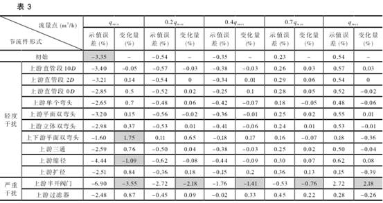 按照CB/T32201-2015的要求(qiú),在輕微擾動影(yǐng)響試驗中,直管(guǎn)段影響不存在(zai)♻️,示值誤差變化(huà)量均未超過0.5%,符(fu)合要求。彎頭、三(san)通、擴管對小流(liu)量的影響超過(guo)1.0%,不符合要求。在(zài)嚴重幹擾試驗(yàn)中,半開閥☀️門影(yǐng)響最大,每個流(liú)量點的影響量(liàng)均超過标準要(yao)求。