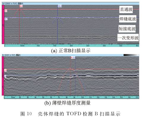 TOFD檢測流(liú)量計殼體(tǐ)焊縫具有(you)優勢,能有(yǒu)效地發現(xiàn)焊縫中的(de)裂紋👄等缺(que)陷,此法的(de)正常B掃描(miáo)顯示具有(you)特點,能🈲明(míng)顯顯示🥵焊(hàn)縫的底波(bō),能準确測(ce)量焊縫的(de)厚😄度,在焊(hàn)縫厚度🛀較(jiào)小(如低于(yú)标準規定(ding)的12mm)時,焊縫(feng)底波也明(ming)顯😄存在,但(dàn)不🌈能用于(yú)缺陷的檢(jiǎn)測,TOFD檢測B掃(sǎo)描顯示如(ru)圖10所🛀示