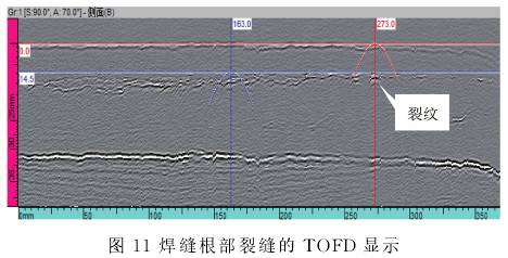 焊縫根(gēn)部裂縫的(de)TOFD顯示如圖(tú)11所示,可見(jiàn)隻有裂紋(wén)的上端點(diǎn)💜顯示🛀,沒有(yǒu)下端點顯(xiǎn)示,焊接接(jiē)頭部位底(di)波受到影(yǐng)響