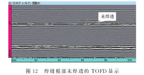 焊縫根(gen)部未焊透(tòu)的TOFD顯示如(rú)圖12所示,上(shàng)端點出現(xiàn)較直或圓(yuán)弧狀斷續(xù)信号顯示(shì),焊接接頭(tóu)部位底波(bō)受💋到影響(xiǎng)。
