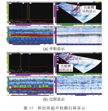 相控陣(zhèn)超聲檢測(ce)掃查方式(shì)是前後移(yi)動結合左(zuǒ)右移動,以(yǐ)底🛀🏻部凹槽(cáo)端角回波(bō)結構波顯(xiǎn)示開始爲(wèi)準🚩,移動探(tàn)頭直到❓其(qi)顯示消失(shī)爲止,探頭(tou)移動到不(bu)同位置時(shí)的顯示如(ru)圖13所✂️示,重(zhòng)點觀察A掃(sǎo)顯示和S扇(shan)形顯示的(de)變化