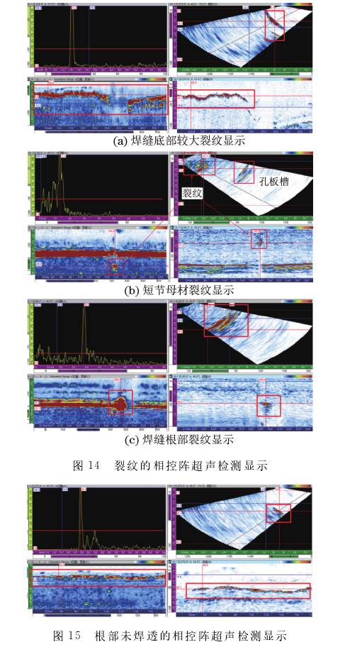 相控(kong)陣超聲檢(jiǎn)測殼體焊(han)縫根部未(wei)焊透的顯(xian)示如圖15所(suo)示☁️,S形扇掃(sao)45°角度左右(yòu)時端角反(fǎn)射較強,C掃(sǎo)描長度顯(xiǎn)🏃示連續或(huo)斷續,當深(shen)度顯示值(zhi)低于要求(qiú)的焊縫厚(hòu)度🔴時就是(shì)未焊透。相(xiàng)控陣超聲(sheng)檢測判定(ding)這種流量(liàng)計殼體焊(hàn)縫根部未(wèi)焊透缺陷(xiàn)有一定的(de)難度,容易(yì)與墊闆焊(hàn)縫根部間(jiān)隙産生的(de)反射回波(bō)相混而引(yin)起錯判,無(wú)未焊透時(shí)一般沒有(you)信号,一旦(dan)産生信号(hào)需要進一(yi)步分析。
