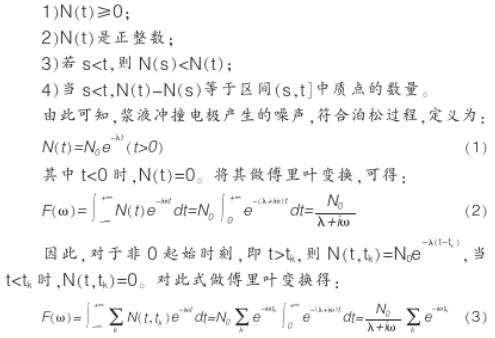 設在一(yi)段時間内(t>0),漿(jiang)液顆粒沖撞(zhuang)電極産生的(de)噪聲電壓值(zhí)的大小與沖(chong)撞電極的顆(ke)粒的大小(流(liu)體濃度)、力度(du)(流體速度).幾(ji)何形狀有關(guan),假定将漿液(yè)顆粒分化爲(wèi)質量、形狀😍統(tǒng)一的質點,漿(jiang)液顆粒🈲沖撞(zhuàng)電極産生的(de)噪聲電壓值(zhi)正比于質點(dian)的數👣量,即在(zài)某一時刻t,産(chǎn)🤩生的噪聲值(zhí)的幅值用質(zhi)點的數量來(lai)描述間。