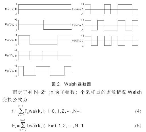Walsh(沃爾(ěr)什)函數是[O,1]定(dìng)義在上完備(bei)、歸一化的正(zhèng)交系,記🔞爲wal(n,k),具(jù)🍉體波形如圖(tu)2所示。其中k爲(wèi)自變量,n爲序(xù)率,表示Walsh函數(shu)在[0,1]間變号的(de)次數,Walsh函數的(de)矩形波幅值(zhi)的取值爲+1或(huò)-1。