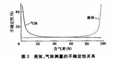 (1)高含氣的(de)影響。多相(xiang)流中氣含(hán)量過高時(shi),容易導緻(zhì)部分液體(ti)分散在氣(qi)相中,超高(gāo)的氣液比(bǐ)是計量不(bú)準的主要(yào)原因。液體(ti)、氣體測量(liàng)的不确定(dìng)性關系如(ru)圖2所示。從(cóng)圖2可以看(kàn)出,當含氣(qì)率(R,)較低時(shí)(<65%),對液體計(ji)量誤差相(xiàng)對較低,而(er)對氣體計(jì)量的誤差(chà)較高,有時(shí)基本沒有(yǒu)參考價值(zhí);相反,當含(han)氣率較高(gao)時(>90%),液體的(de)計量誤差(chà)就會較大(dà),有時會高(gāo)于50%。