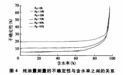 (3)高含水的(de)影響。當被(bei)測流體高(gao)含水時,被(bèi)測的油量(liang)就會産生(shēng)較大的誤(wu)差,同樣當(dang)低含水時(shí),被測水量(liàng)的誤差就(jiu)比較大,其(qi)主要原因(yin)是非高精(jing)度儀表對(duì)微量的計(ji)量誤差會(huì)更明顯。圖(tu)4是純油量(liang)測量的不(bu)确定性與(yǔ)含水率之(zhi)間的關系(xi)。從圖4可以(yǐ)看.出,當單(dan)井的含水(shui)大于80%時,對(duì)油的計量(liang)産生的誤(wù)差大于15%。