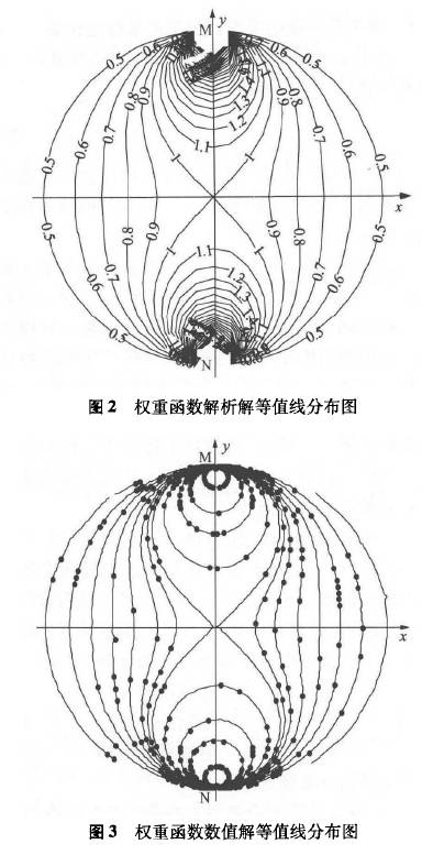 如圖3所示,爲(wèi)權重函數數值解(jie)等值線。将其與圖(tú)2進行對比,發現二(er)者沒有太大差别(bie)。表明利用有限元(yuan)方法計算權重函(hán)數是高效可行的(de)方法,并且可通過(guo)增加網格密度來(lái)提高計算精度。