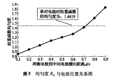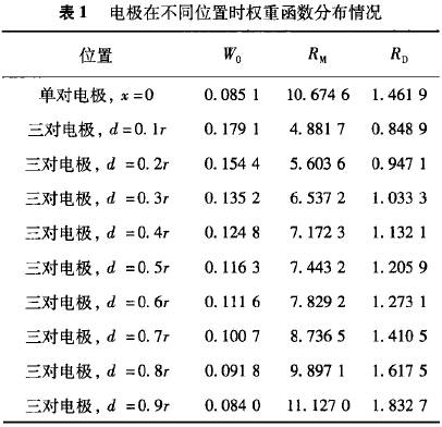 依據上(shang)面兩個指标,計算(suàn)電極處于不同位(wei)置時權重函數分(fèn)布均勻度,如表1所(suo)示。從圖4和表1可知(zhī),權重函數分布情(qíng)況不僅與電極數(shù)目有關,還與電極(ji)分布的位置有關(guān);随着兩側電極與(yu)中間電極距離增(zēng)大,權重函數的平(ping)均值W0逐漸減小,即(jí)相同流速對流量(liàng)計輸出信号的貢(gòng)獻逐漸減弱;随着(zhe)兩側電極與中間(jian)電極距離增大,權(quan)重函數的最大偏(pian)差Rm和RD的值都逐漸(jiàn)增大,權重函數的(de)整體均勻度逐漸(jian)降低。