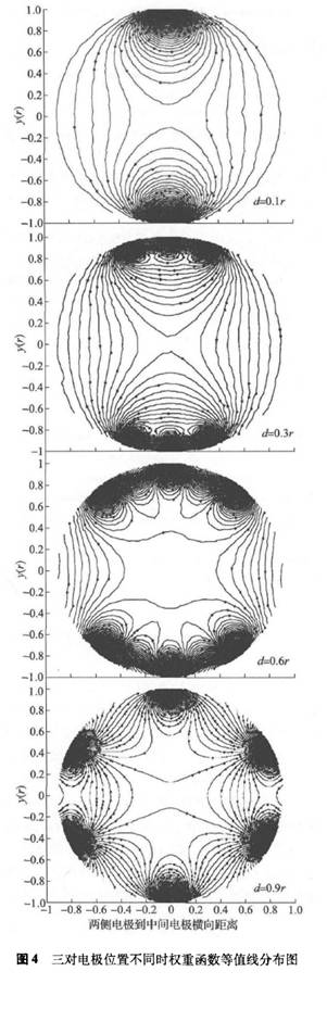 針對三對電(dian)極電磁流量計,對(duì)電極處于管道橫(héng)截面上不同位置(zhi)時權重函數的分(fen)布情況分别進行(háng)仿真,結果如圖4所(suǒ)示。三對電極的位(wei)置分布如下:中間(jian)一對電極橫坐标(biao)爲x=0,兩側電極關于(yú)中間電極對稱,它(tā)們到中間電極的(de)橫向距離爲d,d的範(fan)圍爲0.1r~0.9r,其中r爲傳感(gǎn)器管道内半徑。