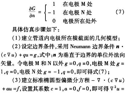 采(cǎi)用有限元方法,使(shǐ)用Malab軟件中PDE工具.箱(xiang),對單電極對電磁(cí)流量計在管道内(nei)電極所在橫截面(mian)上權重函數分布(bu)情況進行數值仿(páng)真。在數值仿真時(shí),關鍵是求解格林(lin)函數G,由于C滿足拉(la)普拉斯方程▽2G=0,假設(she)電磁流量計邊界(jiè)條件如下: