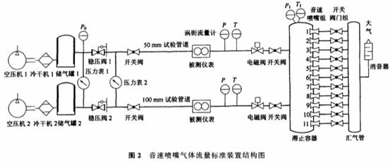 本(běn)文試驗裝(zhuāng)置采用正(zhèng)壓法,工作(zuo)流量範圍(wei)爲工況2.5~666m3/h,工(gong)作壓力範(fan)㊙️圍爲表壓(ya)0.1~0.5MPa,裝置結構(gou)圖如圖2所(suo)示。工作原(yuán)理是:首先(xian)由空壓機(jī)将‼️大氣中(zhōng)的空氣送(sòng)人管道,經(jing)冷幹機除(chú)去水氣後(hòu)打人高壓(yā)儲氣罐中(zhōng),待儲氣罐(guan)壓力升高(gāo)到-定值之(zhī)後,調節穩(wen)壓閥使📱其(qi)下遊管道(dào)壓力穩定(ding)在合适值(zhí),經🈲穩壓閥(fá)調節後進(jin)入試驗管(guan)道的高壓(ya)🏃氣體先後(hòu)流經渦街(jie)流量計、滯(zhì)止容器、音(yīn)速噴嘴組(zu)、彙氣管、消(xiāo)音器後,最(zuì)終通向大(dà)氣。其中✨,音(yīn)速噴嘴組(zǔ)由安裝在(zai)滞止容器(qi)下遊的11個(ge)不同喉徑(jìng)音速噴嘴(zui)并聯而成(chéng),通過控㊙️制(zhì)音速噴嘴(zui)下遊的🏃🏻開(kai)關閥門,可(kě)以任意選(xuan)擇音速噴(pen)嘴的組💜合(he)方式,以達(dá)到改變被(bèi)測儀表流(liú)量的🥵目的(de)。通過對滞(zhi)止容器上(shang)溫🌈度變送(song)器T、壓力變(bian)送器P,信号(hào)采集,代人(ren)公式(5)便可(ke)得到通過(guò)音速噴嘴(zuǐ)的質量流(liú)量,亦即流(liú)過渦街流(liu)量計處的(de)質量流🔞量(liàng)。通過測量(liang)渦街流量(liàng)計處♈的溫(wen)度T和壓力(lì)P,可以計算(suan)出工作狀(zhuang)态下空氣(qì)密度,進而(ér)得到實際(ji)體積流量(liàng)。再根據相(xiàng)同時間♉間(jian)隔内渦街(jie)流量計輸(shū)出脈沖的(de)檢測,可最(zuì)終實現對(duì)渦街流量(liàng)計儀表系(xi)數等流量(liang)特性的研(yan)究。
