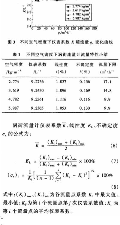 根(gen)據試驗得(de)到的數據(jù),可繪制出(chū)如圖3不同(tóng)空氣密度(dù)下渦街儀(yí)表系數随(sui)流量變化(huà)曲線,并得(dé)到渦街流(liu)量♍計的流(liu)量特性見(jiàn)表1。