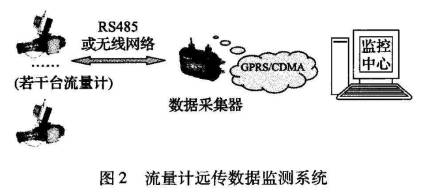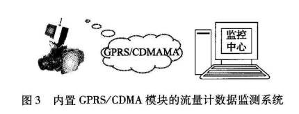 當(dāng)圖2中流量計(ji)内嵌GPRS/CDMA模塊時(shí),流量計即可(kě)直接通過GPRS/CDMA連(lián)💋接到數💛據監(jian)控中心,省略(lue)數據采集器(qi)媒介。如圖🌈3所(suǒ)示。