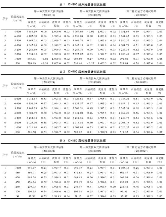 從表1測試(shi)數據可以看(kàn)出,在第--種安(an)裝方式下,DN300超(chao)聲流量計兩(liang)次測試結果(guǒ)的最大偏差(chà)爲0.25%,最小偏差(chà)爲0.01%,未超出工(gong)作級标準裝(zhuang)置㊙️體積流量(liàng)擴展不确定(ding)度0.29%;從表2測試(shi)數據可以看(kan)出,在第一種(zhǒng)安👣裝方式下(xia),DN400渦🆚輪流量計(jì)兩次測試結(jie)果的最大偏(piān)差爲0.22%,最小偏(piān)差爲0.06%,未超出(chu)工💔作級标準(zhun)裝🈲置體積流(liu)量擴展不确(què)定度0.29%;在表3數(shù)據可♌以看出(chū),在第一-種安(ān)裝方式下🔱,DN150渦(wo)輪流量計兩(liǎng)🏒次測試結果(guo)除了流量分(fen)🐇界點q.以下最(zui)小測試點53m3/h示(shì)值偏差爲0.23%,其(qí)餘的測試點(dian)最大偏差爲(wèi)0.09%,最小偏差爲(wèi)0.01%,未超出臨界(jie)㊙️流噴嘴标準(zhǔn)裝置質量流(liu)量擴展不确(què)定度爲0.22%。測試(shi)數據同時表(biǎo)明三台流量(liàng)計的穩定性(xìng)、重複性良好(hao)。