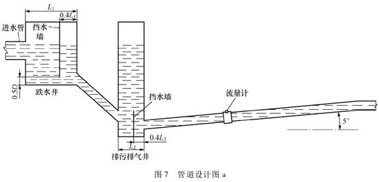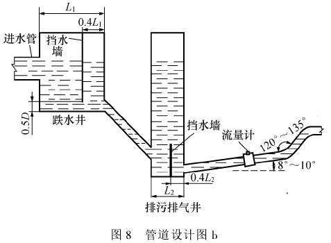 爲保(bǎo)證大口徑流量(liàng)計正常計量,其(qi)前後直管段、介(jie)質🆚滿管、不能存(cun)氣等要求是需(xu)要滿足的。但現(xian)場安裝條🍉件各(gè)不相同,針對不(bu)🔱同情況,從正确(què)計量的角度出(chu)發,本文提出了(le)兩種管道🛀🏻鋪設(shè)及流量計安裝(zhuang)☎️的建議,分别如(ru)圖7和圖8所示。管(guǎn)道直徑爲D,跌水(shuǐ)井長度爲L,配置(zhi)擋水牆,擋水牆(qiang)🌍底部距井底約(yue)0.5D,牆體距離右壁(bi)約0.4L,;排污排氣井(jing)爲正方形,尺寸(cun)爲1.5D×1.5D.即圖示㊙️L2=1.5D.内置(zhì)擋水牆,擋水牆(qiang)頂與.上遊管頂(ding)平齊,牆體距離(li)右壁🌈約0.4L2。
