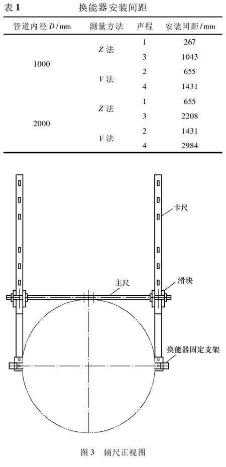 由于待測管徑(jing)巨大,管道截面(miàn)爲非标準圓形(xíng)。以DN1800管道☀️爲例,不(bú)同位置的外徑(jìng)最大可差35mm,極限(xian)情況下,若傳感(gǎn)器安裝位置的(de)直徑🔴與平均直(zhí)徑的差值恰好(hao)爲外徑最大差(cha)即35mm,僅截面面積(jī)一項帶㊙️來的誤(wu)差就達3.8%。,傳統的(de)圍尺測量直徑(jing)的方法獲得的(de)是平均管☁️徑,但(dàn)無法指導檢測(ce)人員将換能器(qi)安裝在平均管(guan)徑位置;即使⛱️在(zai)換能器之間增(zeng)🙇♀️加滑軌,也隻能(néng)保證換能器安(ān)裝間距準确,不(bú)能保證換能器(qi)連線的投影與(yu)軸線平行。因此(cǐ),本文設計了一(yi)套便🈲于攜帶、易(yi)于現場組裝的(de)輔助設☔備即輔(fu)尺,用于定位、安(ān)🈲裝換能器,基本(běn)結構如圖3、圖4所(suo)示。輔尺測量管(guǎn)徑範圍:800~2200mm,其主尺(chǐ)測.量不确定度(dù)U=0.5mm(k=2)。能夠測💘量管道(dao)截面任意位置(zhì)的外徑,保證換(huan)能器連線平行(hang)于管道軸心,較(jiao)好地✏️解決換能(neng)器安裝位置不(bu)精準帶來的問(wèn)題,盡可能地降(jiàng)低測量過程中(zhong)的人爲影響,實(shi)用性強。