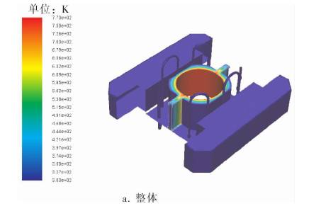 盤管(guan)有冷卻時電磁流(liu)量計溫度雲圖如(rú)圖6所示其中最高(gāo)溫度爲設定的液(ye)态金屬溫度773.15K。電磁(ci)流量計關鍵部位(wèi)的三維溫度場如(ru)圖7所示。可以看出(chū),有了盤管内的冷(leng)卻水,借助.銅導體(ti)良好的熱導率,可(kě)以把電磁流量計(ji)的最高溫度維持(chí)在80℃左右,滿足低于(yú)100℃的設計要求。