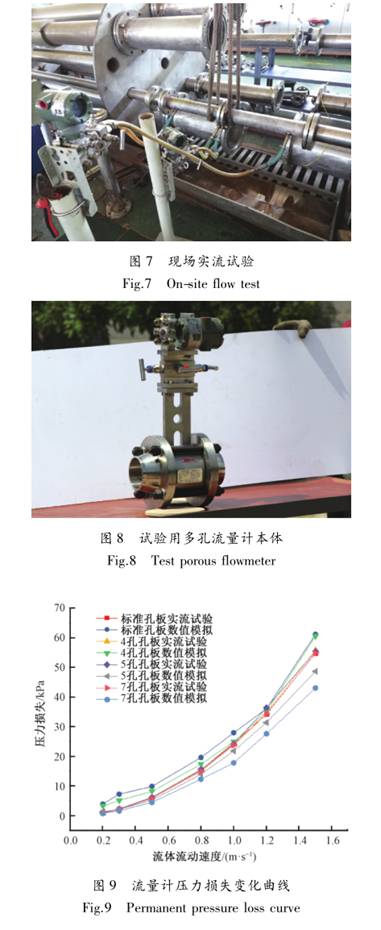 爲了與數(shù)值模拟結果進(jìn)行比較,相應設(she)置保持一緻性(xìng):介質💯采用水(環(huan)境溫度5℃~45℃)、濕度35%RH~95%RH、大(dà)氣壓力86kPa~106kPa,流速(0.2、0.3、0.5、0.8.1.0.1.2.1.5m/s),管(guǎn)路規格DN80(節流元(yuán)件上下側直管(guǎn)段長度約爲5m,充(chong)分保證了多孔(kong)平衡流量計測(ce)量中對前後直(zhi)管段研究的要(yào)求),取壓方式爲(wèi)法蘭取壓(上下(xia)遊取壓孔軸線(xian)距離多孔流量(liang)計節流件上下(xia)遊端面均爲25.4+0.5mm)。其(qí)他參數爲介質(zhi)水密度ρ=998.403kg/m3、動力粘(zhan)度1.0mPa.s、流東膨脹系(xì)數e=1。實流試驗現(xiàn)場如圖7所示,試(shì)驗用對稱多孔(kǒng)孔闆差壓式流(liú)量計如圖8所示(shi)。