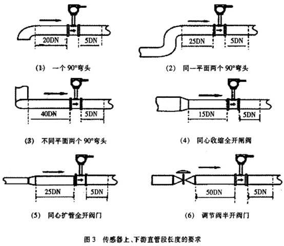 (2)渦(wō)街流量傳感器的(de)上遊側和下遊側(ce)應有較長的直管(guan)段。其上、下遊直管(guǎn)段長度根據管道(dao)狀況不同而不同(tong),直管段的具體安(ān)裝長度和要求見(jiàn)下圖3。