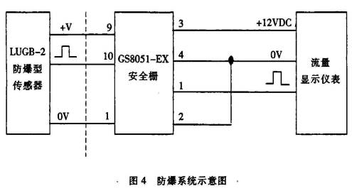 防爆型傳感(gǎn)器必須與合适的(de)關聯設備安全栅(shan)組成本質安全型(xing)防爆系統(見圖4),通(tōng)過電源.信号安全(quan)栅再連接到流量(liang)顯示儀表上。