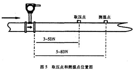 (3)取壓(yā)點和測溫點,應分(fèn)别在傳感器的下(xià)遊3-5DN處和6~8DN處見圖5。