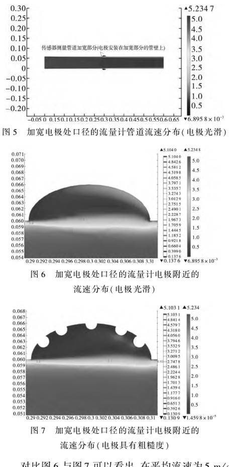 對比圖6與圖7可(kě)以看出,在平均(jun)流速爲5m/s的條件(jian)下,加寬電極處(chu)管道口徑後,測(ce)量電極附近的(de)流場基本不受(shòu)電極表面粗糙(cao)度的影響,這樣(yàng)可以避免電極(ji)的表面粗糙度(dù)📧對電磁流量傳(chuan)感器測量所造(zào)成的誤差,從而(ér)證明了該方案(an)的可行性