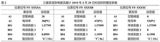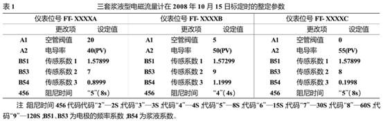 該(gāi)三台流(liu)量計經(jīng)使用18個(gè)月後于(yu)2025-12-16因計量(liàng)誤差太(tai)大導緻(zhì)氣⛷️化📞爐(lu)跳車。經(jing)拆體檢(jiǎn)查和原(yuán)始安裝(zhuang)數據比(bǐ)較發現(xiàn)三台漿(jiāng)液型電(diàn)磁流量(liàng)計防護(hu)裏襯整(zhěng)體平均(jun1)磨損了(le)0.8毫米的(de)厚度,但(dan)感應電(diàn)極因出(chu)廠加裝(zhuang)了碳化(huà)鎢防護(hù)膜而保(bǎo)護特好(hao)導緻了(le)流量計(jì)電級與(yu)裏襯物(wù)理與幾(ji)何結構(gou)的不匹(pi)配。爲了(le)不影響(xiǎng)正常經(jīng)廠家傳(chuan)真确認(ren)“要求用(yòng)角向磨(mó)光機将(jiāng)碳化鎢(wu)防🏒護膜(mó)平均打(da)磨0.8毫📐米(mǐ)的厚度(du)後對流(liu)量計重(zhong)新标定(dìng)和整定(ding)參數”。我(wǒ)公司嚴(yan)格按廠(chǎng)家要求(qiú)進行檢(jian)修标定(ding)和參數(shu)整定現(xiàn)将标定(ding)時整定(dìng)好的參(cān)數附後(hou)見表2以(yǐ)供參考(kao)。