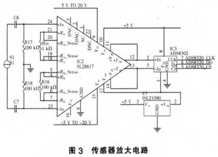 電路如圖3所示。IC2(SL28617)前(qian)置放大器用于放(fàng)大傳感器送來的(de)反映流量大小的(de)電壓信号,改.變圖(tu)中Rm和R。的阻值大小(xiao)☁️,可以改變該運算(suan)放大器的增益。S1是(shi)勵磁信号🌍源,R17、R18是輸(shu)人偏置電阻,運放(fang)的9腳和16腳分别供(gòng)+5V電壓,接在運放IC2輸(shu)出端的IC3(ADS8320)是16位高速(sù)的A/D轉換器,其轉換(huan)速度🈲可達16kHz/s,接在前(qián)置放大器與A/D轉換(huan)器之間的IC12(ISL21090)是三端(duān)穩☎️壓器。
